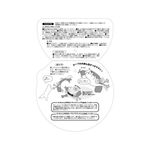 【注意】キャットニップに反応すると転げ回ったり体をこすりつけたり、特有の陶酔状態になりますが、しばらくすると通常の状態に戻ります。特有の陶酔状態時の事故を防ぐため、倒れやすいものや階段の近くでは遊ばせないでください。【使用上及び保管上の注意】●猫の玩具以外の用途には使用しないでください。●飼い主が遊ばせる玩具ですので絶対に猫だけで遊ばせないでください。●使用前に壊れていないか(その都度)点検してください。●子供が使用する場合は、保護者の方が使用方法などを指導してください。●使用中に壊すことがあります。すぐに使用を中止してください。●色落ちしますので、猫の唾液がついたときは速やかに乾燥させてください。●万一、人やペットが部品を誤飲した時はすぐに医師に相談してください。●劣化を早める原因となりますので、直射日光の当たる所や湿気の多い所で保管しないでください。●使用後は必ず幼児や子供、ペットが勝手に持ち出さない場所に保管してください。【警告】●危険ですので、人や猫に向かって投げたり叩いたりしないこと。●猫が興奮して遊びますので、子供のいる場所や段差、危険物や火気の付近では絶対に使用しないこと。●猫が飛びかかってくる場合があるので、なるべく人から離して使用すること。