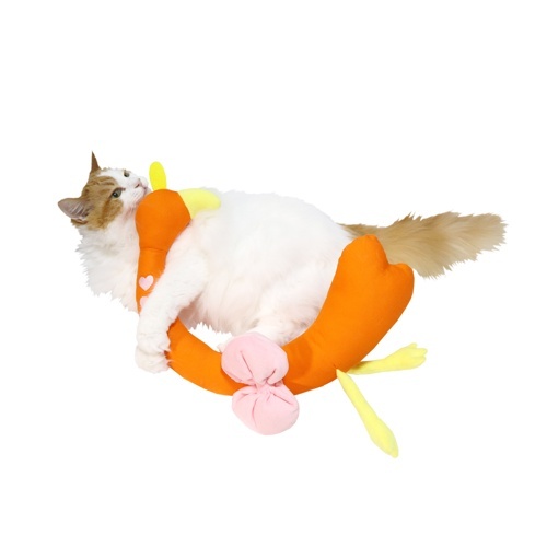 猫ちゃんが抱きつきやすい曲線でけりけりしやすい!リボンの位置を変えれるので猫ちゃんの大きさ問わず遊べます。首のハート部分にキャットニップ入り。