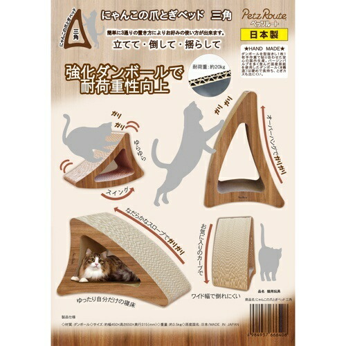 3通りの使い方が出来る爪とぎ、立てると左右お好みのカーブで爪とぎ、倒すとなだらかなスロープ、ひっくり返すとゆりかごベッドにもなります。強化ダンボールを使用して耐荷重性がアップ。