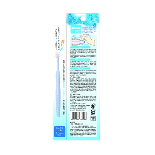 ミルク配合で嫌がりにくく、唾液の分泌も促します。軟質樹脂毛と抗菌ナイロン毛を交互に配置。磨く向きは自由自在!