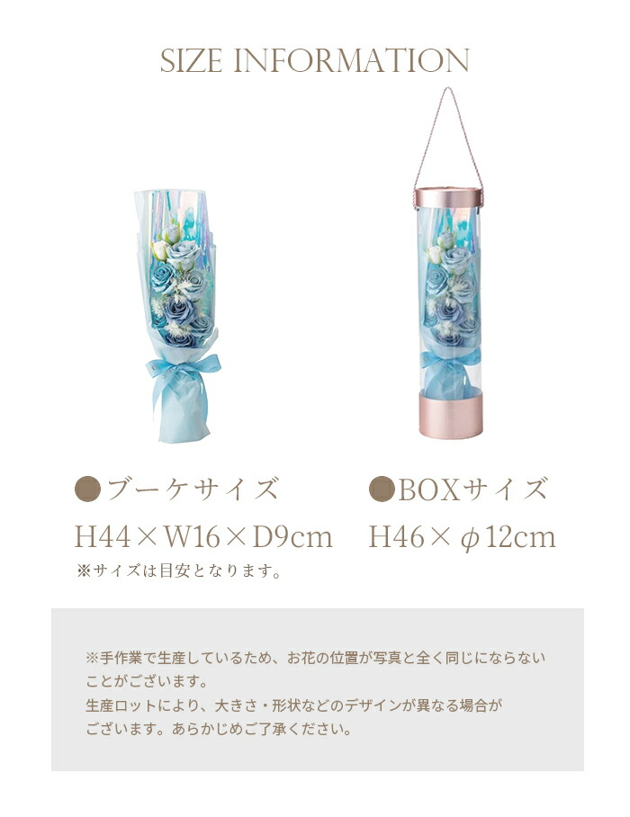 華やかなブーケをそのまま収めた筒形の専用BOX入りで、