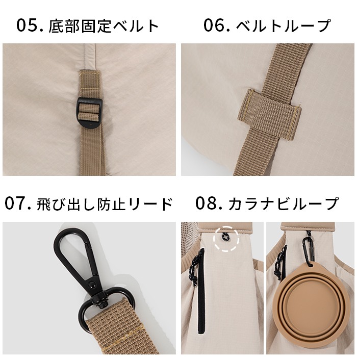 4.キャリーバッグのメッシュ部分は柔らかい素材で作られている為、ペットの爪や歯でメッシュ部分が傷つく可能性があります。予めご了承ください。