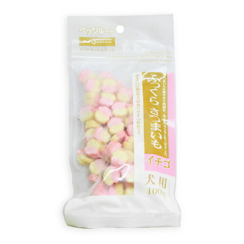 半分イチゴ入り!さつまいも&鶏ささみを主原料にふっくら仕上げて、与えやすいようにカットしました。