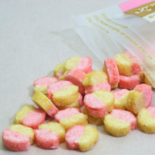 小麦粉、鶏ささみ、ショートニング、さつま芋パウダー、苺パウダー、ソルビトール、プロピレングリコール、膨張剤、保存料、pH調整剤、食塩、食用色素(赤106、黄4、黄5、酸化チタン)、香料、酸化防止剤