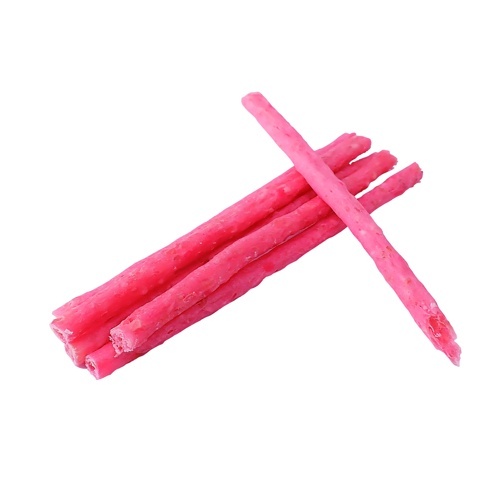 イチゴ果汁と牛皮を練り混ぜ、ほどよい堅さにしました。小さなお口でも噛みやすい!発色剤・酸化防止剤無添加!