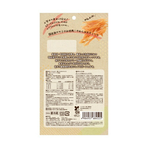【使用上の注意】ドッグ用のスナックです。※本品は間食です。生後3ヶ月位まで(離乳期前後)の幼犬には与えないでください。成長期なので、主食だけをあげてください。※愛犬の性格や食べ方、お腹の減り具合では、のどに詰まらせたりする場合があります。個体差により適切な大きさにして、目の届く所で与えてください。※お子様が愛犬に与える時は、安全のため大人が立ち会ってください。※給与量を参考に、愛犬が食べ過ぎないようにしてください。※アレルギーのある愛犬には、原材料を確認してから与えてください。※愛犬の体調が悪くなった時には獣医師に相談してください。【保存上の注意】〈未開封〉幼児やペットの手が届かない所で、直射日光、高温多湿を避けて保存してください。常温で保存できますが、なるべく低温で保管してください。〈開封後〉チャックを閉じ、必ず冷蔵庫で保存してください。おいしさが落ちますので早めに与えてください。鮮度を保つために、脱酸素剤を入れていますが、食べ物ではありません。誤飲をしないよう、直ぐに捨ててください。