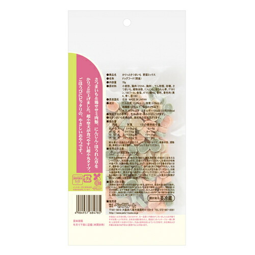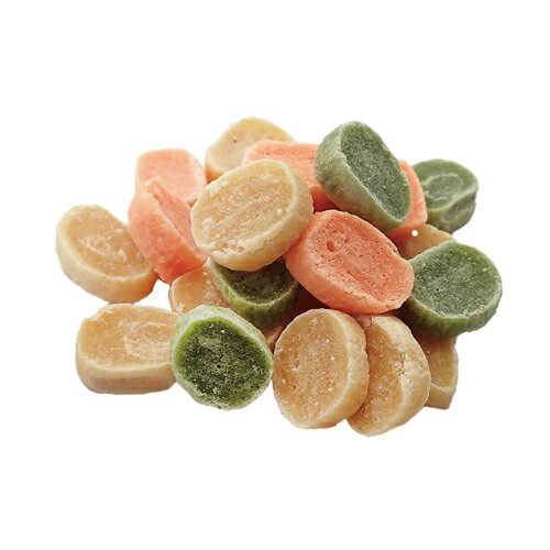 さつまいも&鶏ササミ肉類、にんじん・ほうれん草をかりっと仕上げました。超小型犬が食べやすい超小丸タイプ。ごほうびにピッタリの、やさしいおやつです。