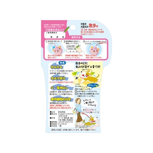 【使用上の注意】◆ケース内の虫よけチップを取り出さないでください。◆ペットの首輪に付けないでくださいペットや子供が舐めないようにしてください。◆子供やペットがおもちゃにしないようにしてください。◆車内等の狭い空間に放置しないでください。【相談すること】●アレルギーやかぶれを起こしやすい体質の人やペットは仕様に注意してください。万一、異常を感じた場合は本品がピレスロイド系の薬剤であることを医師または獣医師に告げて、診察を受けてください。【使用中の注意】●使用方法を守り、定められた用途以外では使用しないでください。●ケースを破り、虫よけチップを直接触った場合は石けんでよく洗い流してください。●ペットがもてあそぶ場合はすぐに使用を止めてください。●観賞魚等のいる水槽に誤って落とさないようにしてください。●飼育用の虫を飼われている場合は、その付近には絶対に放置しないでください。●殺虫剤ではありませんので、害虫が大量発生している場合はエアゾール殺虫剤のご使用をお勧めします。●使用後は各自治体の定める方法で捨ててください。【保管及び取扱上の注意】●散歩から帰宅後は直射日光や火気を避け、風通りのいい涼しいところに保管し