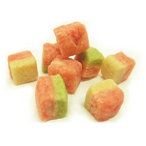 小麦粉、鶏肉、鶏ささみ、チーズ、牛肉、でん粉類、ほうれん草、ソルビトール、グリセリン、膨張剤、食用色素(赤106、黄4、黄5、青1、酸化チタン)、保存料(ソルビン酸K)、pH調整剤、食塩、酸化防止剤、香料
