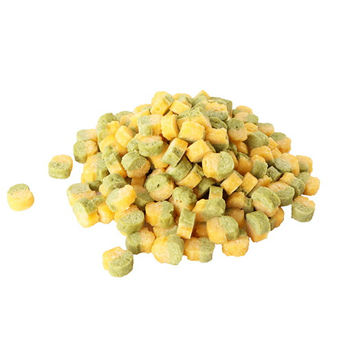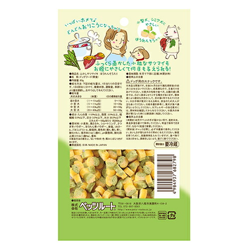 小麦粉、鶏ささみ、ショートニング、さつま芋パウダー、ほうれん草パウダー、食塩、ソルビトール、プロピレングリコール、膨張材、着色料(黄4、黄5、青1、酸化チタン)、保存料(ソルビン酸K)、pH調整剤、酸化防止剤(エリソルビン酸Na)、香料