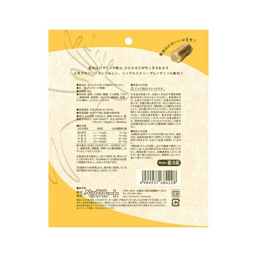鹿肉、小麦粉、糖類、でん粉類、グリセリン、植物油脂、膨張剤、ソルビトール、調味料、食塩、ポリリン酸Na、コンドロイチン、グルコサミン