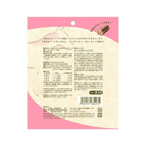 馬肉、小麦粉、糖類、でん粉類、グリセリン、植物油脂、膨張剤、ソルビトール、調味料、天然着色料(クチナシ色素)、食塩、ポリリン酸Na、コンドロイチン、グルコサミン