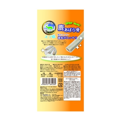 野生のエゾ鹿が原料です。鹿の骨の長さは基準を決めてカットしておりますが、野生の鹿の骨を使用しておりますので、形状や大きさ、色、堅さ、重さ、厚みが相当バラつきます。ご了承ください。【安全にお与え頂くための注意】※必ず大人が見ている所で与えてください。※商品特性上割れる場合があります。※直ぐに割ってしまったら、丸のみする場合は、与えるのを止めてください。※骨が小さくなると丸のみしやすいので早めに交換してください。【使用上の注意】ドッグ用のスナックです。※生後6ヵ月位まで(離乳期前後)の幼犬には与えられません。乾燥度の高い製品ですので新鮮な水をいつもそばに置いてください。噛まずに飲み込んで食べる愛犬には与えないでください。骨が割れて先が尖った状態になると危険ですので、食べ残した骨を小まめに確認してください。※開封後は(冷蔵庫へ入れる必要はありませんが)なるべく低温で保管してください。※途中で取り上げる場合は、カビが生えやすいため、唾液が付着した部分は乾かしてから保管してください。※沢山食べすぎると便がカルシウムで白っぽくなったり、水分不足で硬くなったりする事があるので、様子を見ながら少しずつお与えください。※万一、大きなかたまりを誤飲した場合は、直ぐに獣医師に相談してください。