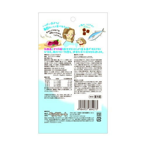 ●製造方法の都合上、色、大きさ、形状、香り、かたさにばらつきがあります。●黒い粒は原料の一部ですので品質に問題ありません。【使用上の注意】ドッグ用のスナックです。※本品は間食です。生後3ヶ月位まで(離乳期前後)の幼犬には与えないでください。成長期なので、主食だけをあげてください。※愛犬の性格や食べ方、お腹の減り具合では、のどに詰まらせたりする場合があります。個体差により適切な大きさにして、目の届く所で与えてください。※お子様が愛犬に与える時は、安全のため大人が立ち会ってください。※給与量を参考に、愛犬が食べ過ぎないようにしてください。※アレルギーのある愛犬には、原材料を確認してから与えてください。※愛犬の体調が悪くなった時には獣医師に相談してください。【保存上の注意】〈未開封〉幼児やペットの手が届かない所で、直射日光、高温多湿を避けて保存してください。常温で保存できますが、なるべく低温で保管してください。〈開封後〉チャックを閉じ、必ず冷蔵庫で保存してください。おいしさが落ちますので早めに与えてください。鮮度を保つために、脱酸素剤を入れていますが、食べ物ではありません。誤飲をしないよう、直ぐに捨ててください。