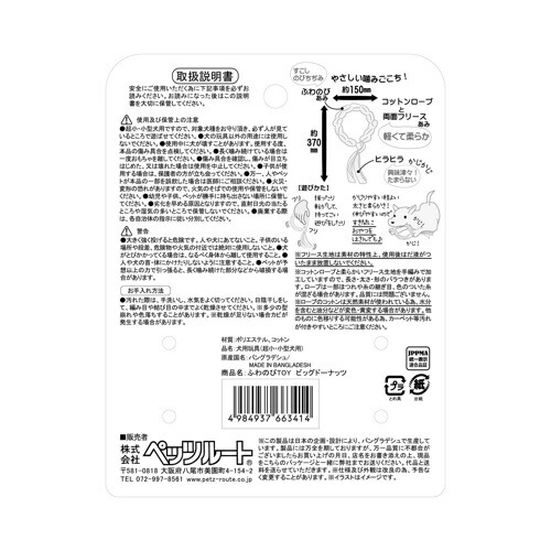 【使用上及び保管上のご注意】●超小・小型犬用ですので、対象犬種をお守り頂き、必ず人が見ているところで遊ばせてください。●犬の玩具以外の用途には使用しないでください。●使用中に犬が壊すことがあります。使用する度、本品の傷み具合を点検してください。●長く噛み続けている場合は一度おもちゃを離してください。●傷み具合を確認し、傷みが目立ちはじめた、又は壊れた場合は使用を中止してください。●子供が使用する場合は、保護者の方が立ち会ってください。●万一、人やペットが本品の一部を誤飲した場合は医師にご相談ください。●火災・変形の恐れがありますので、火気のそばでの使用や保管をしないでください。●幼児や子供、ペットが勝手に持ち出さない場所に保管してください。●劣化を早める原因となりますので、直射日光の当たるところや湿気の多いところで保管しないでください。●廃棄する際は、各自治体の指示に従い分別してください。【警告】●大きく強く投げると危険です。人や犬にあてないこと。子供のいる場所や段差、危険物や火気の付近では絶対に使用しないこと。●犬がとびかかってくる場合は、なるべく身体から離して使用すること。●人や犬の首・体にかけたりしないように注意すること。●ペットが予想以上の力で引っ張ると、長く噛み続けた部分などから破損する場合があります。【お手入れ方法】●汚れた際は、手洗いし、水気をよく切ってください。編み目や結び目の中までよく乾燥させてください。※多少の型崩れや色落ちすることがあります。※フリース生地は素材の特性上、使用後は、だ液がついたまま放置しないでください。※コットンロープと柔らかいフリース生地を手編みで加工していますので、長さ・太さ・形のバラつきがあります。ロープは一部ほつれや糸の継ぎ目、色のついた糸が混ざる場合があります。品質には問題ございません。※ロープは天然コットン素材が使われている為、水分を含むと変色・黄変する場合があります。他のものに色移りする可能性がある為、カーペット等汚れが付きやすいところにご注意ください。