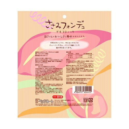 鶏ささみ、牛皮、タピオカでん粉、小麦粉、ソルビトール、グリセリン、プロピレングリコール、pH調整剤、酸化防止剤(エリソルビン酸Na)、発色剤(亜硝酸Na)