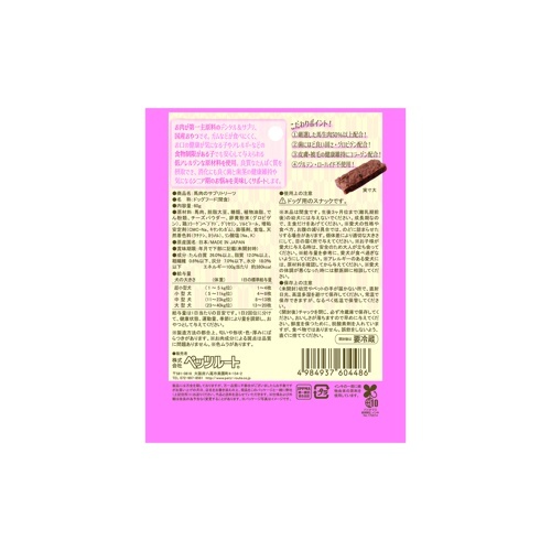 【使用上の注意】ドッグ用のスナックです。※本品は間食です。生後3ヶ月位まで(離乳期前後)の幼犬には与えないでください。成長期なので、主食だけをあげてください。※愛犬の性格や食べ方、お腹の減り具合では、のどに詰まらせたりする場合があります。個体差により適切な大きさにして、目の届く所で与えてください。※お子様が愛犬に与える時は、安全のため大人が立ち会ってください。※給与量を参考に、愛犬が食べ過ぎないようにしてください。※アレルギーのある愛犬には、原材料を確認してから与えてください。※愛犬の体調が悪くなった時には獣医師に相談してください。【保存上の注意】〈未開封〉幼児やペットの手が届かない所で、直射日光、高温多湿を避けて保存してください。常温で保存できますが、なるべく低温で保管してください。〈開封後〉チャックを閉じ、必ず冷蔵庫で保存してください。おいしさが落ちますので早めに与えてください。鮮度を保つために、脱酸素剤を入れていますが、食べ物ではありません。誤飲をしないよう、直ぐに捨ててください。