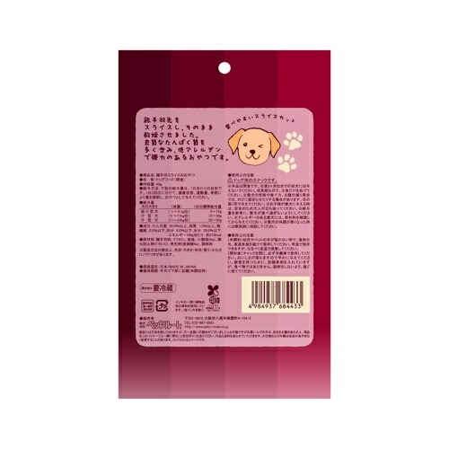【使用上の注意】ドッグ用のスナックです。※本品は間食です。生後3ヶ月位まで(離乳期前後)の幼犬には与えないでください。成長期なので、主食だけをあげてください。※愛犬の性格や食べ方、お腹の減り具合では、のどに詰まらせたりする場合があります。個体差により適切な大きさにして、目の届く所で与えてください。※お子様が愛犬に与える時は、安全のため大人が立ち会ってください。※給与量を参考に、愛犬が食べ過ぎないようにしてください。※アレルギーのある愛犬には、原材料を確認してから与えてください。※愛犬の体調が悪くなった時には獣医師に相談してください。【保存上の注意】〈未開封〉幼児やペットの手が届かない所で、直射日光、高温多湿を避けて保存してください。常温で保存できますが、なるべく低温で保管してください。〈開封後〉チャックを閉じ、必ず冷蔵庫で保存してください。おいしさが落ちますので早めに与えてください。鮮度を保つために、脱酸素剤を入れていますが、食べ物ではありません。誤飲をしないよう、直ぐに捨ててください。