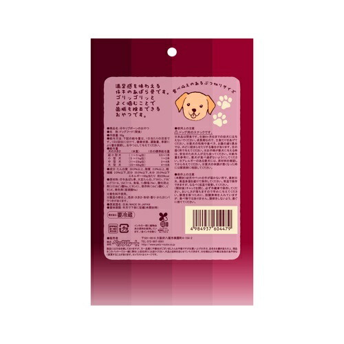 【使用上の注意】※本品は間食です。生後6ヶ月位までの幼犬には与えないでください。成長期なので、主食だけをあげてください。※愛犬の性格や食べ方、お腹の減り具合では、のどに詰まらせたりする場合があります。目の届く所で与えてください。※お子様が愛犬に与える時は、安全のため大人が立ち会ってください。※給与量を参考に、愛犬が食べ過ぎないようにしてください。※アレルギーのある愛犬には、原材料を確認してから与えてください。※愛犬の体調が悪くなった時には獣医師に相談してください。【保存上の注意】〈未開封〉幼児やペットの手が届かない所で、直射日光、高温多湿を避けて保存してください。常温で保存できますが、なるべく低温で保管してください。〈開封後〉チャックを閉じ、必ず冷蔵庫で保存してください。おいしさが落ちますので早めに与えてください。鮮度を保つために、脱酸素剤を入れてますが食べ物ではありません。誤飲をしないよう、直ぐに捨ててください。