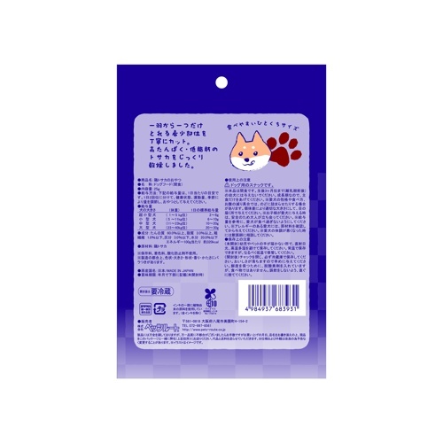 【使用上の注意】ドッグ用のスナックです。※本品は間食です。生後3ヶ月位まで(離乳期前後)の幼犬には与えないでください。成長期なので、主食だけをあげてください。※愛犬の性格や食べ方、お腹の減り具合では、のどに詰まらせたりする場合があります。個体差により適切な大きさにして、目の届く所で与えてください。※お子様が愛犬に与える時は、安全のため大人が立ち会ってください。※給与量を参考に、愛犬が食べ過ぎないようにしてください。※アレルギーのある愛犬には、原材料を確認してから与えてください。※愛犬の体調が悪くなった時には獣医師に相談してください。【保存上の注意】〈未開封〉幼児やペットの手が届かない所で、直射日光、高温多湿を避けて保存してください。常温で保存できますが、なるべく低温で保管してください。〈開封後〉チャックを閉じ、必ず冷蔵庫で保存してください。おいしさが落ちますので早めに与えてください。鮮度を保つために、脱酸素剤を入れていますが、食べ物ではありません。誤飲をしないよう、直ぐに捨ててください。