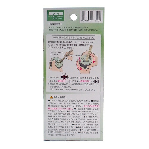 ●スティック型ガム以外はご使用しないでください。●本品は犬用ですので他のペットにはご使用しないでください。対象犬種は超小型・小型犬ですので必ずお守りください。※小型犬種で口の大きなMDフンド・柴犬等や本品が口に入るその他の中・大型犬にはご使用しないでください。●本品は必ず人が見ている所でご使用してください。●愛犬が本品を噛むと破損の原因になります。ご使用前に本品が破損していないか確認してください。破損がある場合はご使用を中止してください。●残ったガムはその都度取り出してください。直接穴に指を入れて取り出さないで指はさみには注意してください。必ず本品の上下フタを開けて取り出してください。●取り出したガムは丸飲み誤飲しないよう手で与えてください。●お子様がご使用する場合は、安全の為大人が立ち会ってください。●万一、愛犬が本品破損の一部を誤飲した場合は獣医師にご相談ください。●廃棄する際は、各自治体の指示に従い分別してください。