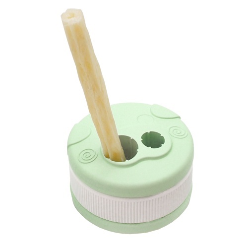 デンタルガムをポンと入れてギュッと回すだけで簡単にセットでき、立てて固定できるから楽しく噛めてデンタル効果UP!