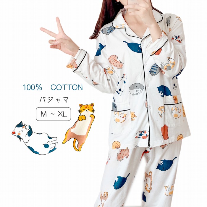 スイモク 【送料無料】ネコ柄 パジャマ 綿100% 長袖 ルームウェア セットアップ ペアパジャマ レディース 上下セット 2ways 部屋着 薄手 柔らかい お肌に優しい きれいめ 大人 カジュアル5677470