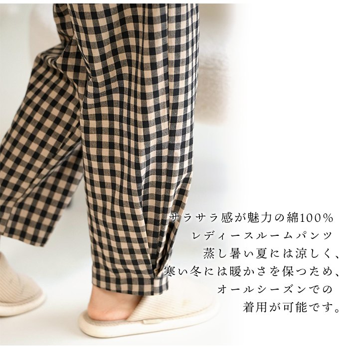 レディースルームパンツ 綿100% サラサラ感 通気性 吸湿性 シンプルデザイン スタイリッシュ 女性らしいシルエット ポケット付き フィット調整可能 カジュアルスタイル リラックスウェア チェック柄 オールシーズン対応 快適な着心地 M~XLサイズ対応 おしゃれルームウェア スッキリ オシャレ
