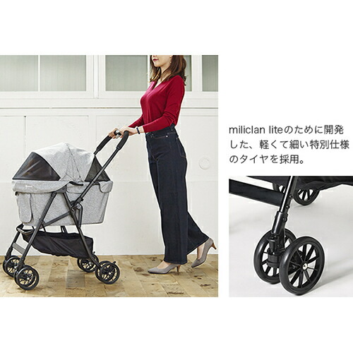 中型犬や大きめの猫ちゃん、多頭飼いにも最適なゆったりサイズに押しやすさと持ち運びやすさを備えた軽量タイプが新登場。1.キャリーがゆったり大きくても、軽い操作性の5.1kg軽量ボディ。(小回りラクラク!軽くて細い特別仕様のタイヤを採用) 2.開閉しやすいファスナー式の幌でペットの抜け出しを防止。 3.キャリー付きのまま、ワンタッチで折りたたみ!(コンパクト&軽量設計で女性でも持ち運びラクラク)