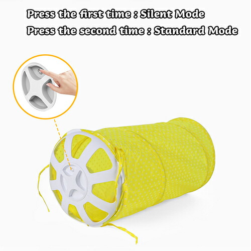自動回転フェザーベースが付いた猫用トンネルおもちゃ。床に横に置いても、垂直に立てても遊ぶこともできます。ボタン1回押すとサイレントモード・ボタン2回押すと鳥のさえずりが奏でるモードになります。