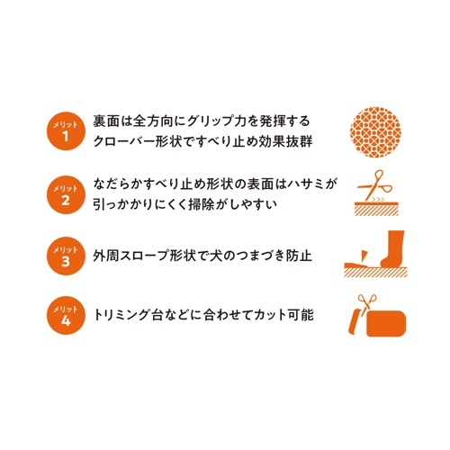 使用箇所は「トリミングテーブル」「ドッグバス」「ケージ」「床の上」など様々な場所でお使いいただけます。製品特長1.裏面は全方面にグリップ力を発揮するクローバー形状ですべり止め効果が抜群です2.表面はなだらかすべり止め形状でハサミが引っかかりにくく掃除しやすいです3.水に沈みます4.トリミング台などに合わせてカット可能です