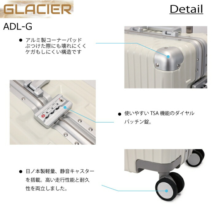 Glacier キャリーケース スーツケース 機内持ち込み 静音キャスター TSAダイヤル式 丈夫 頑丈 33L〜90L シルバー ブラック クリーム 3サイズ 50cm 58cm 68cm ADL-adl-g