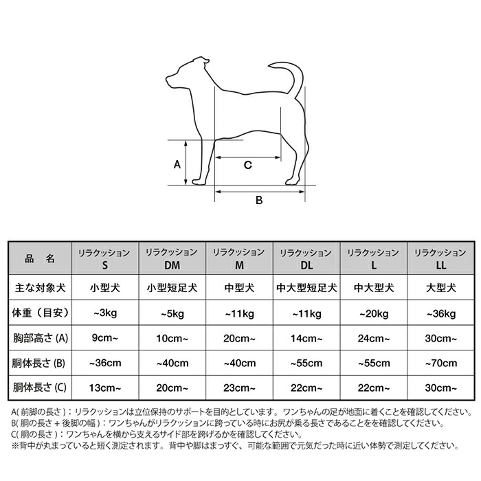 Aクッションの変形が大きく体勢が不安定になるおそれがあるため目安を大きく超えたワンちゃんのご利用はご遠慮ください。