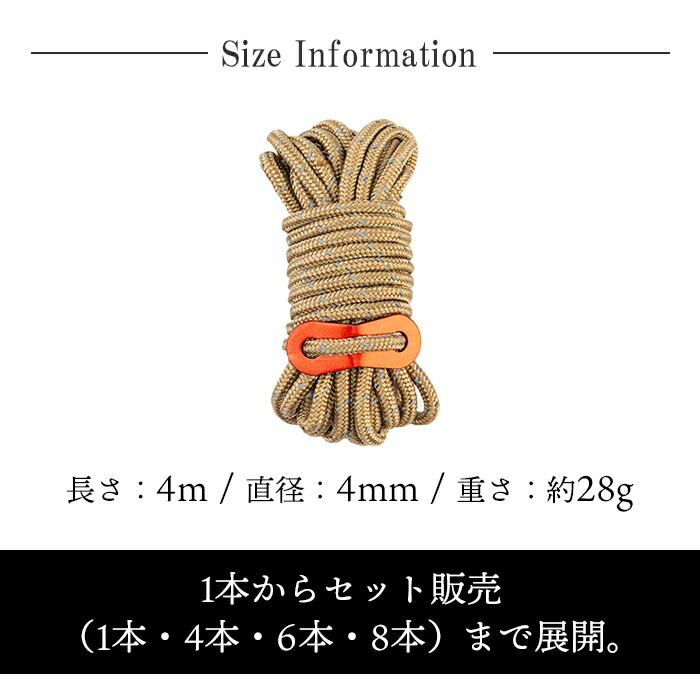 テントロープ ガイロープ パラコード 紐 ひも タープロープ キャンプ ロープ ガイドロープ 反射材入り 反射 夜 太さ4mm 長さ4m アルミニウム合金 自在金具 高耐久 選べる12色 キャンプ ソg323