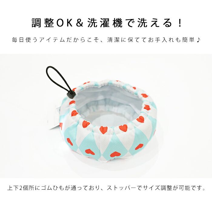 上下2個所にゴムひもが通っており、ストッパーでサイズ調整が可能です。