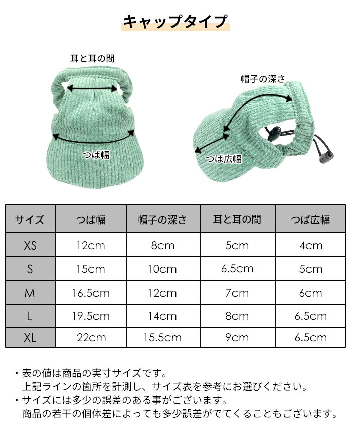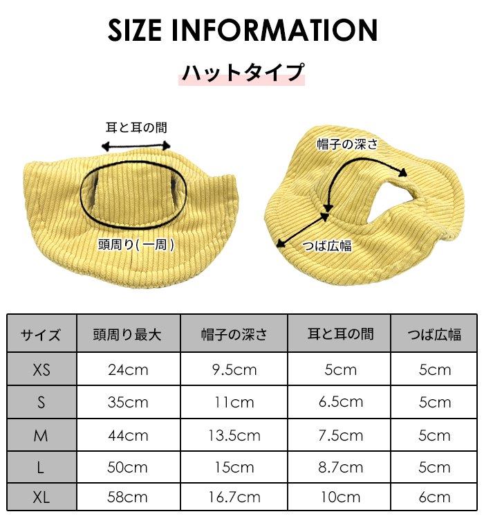 XS:つば幅12/帽子の深さ8/耳と耳の間5/つば広幅4cm