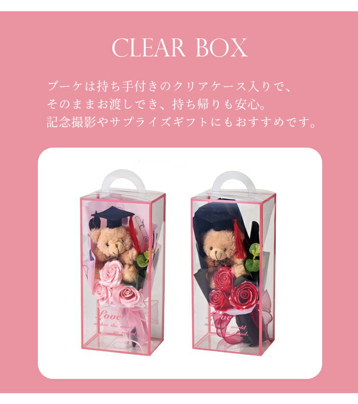 ブーケは持ち手付きのクリアケース入りで、