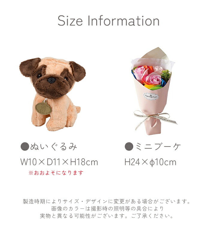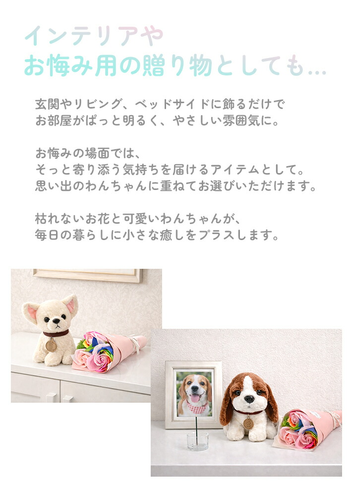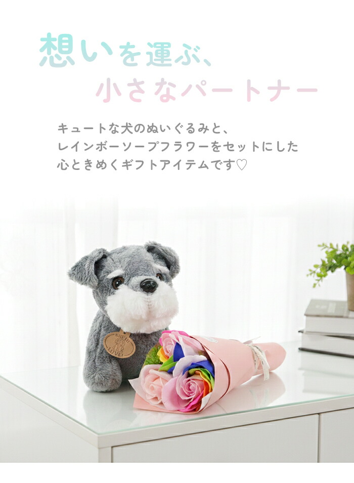犬 ぬいぐるみ レインボーローズブーケ ソープフラワーセット 虹の橋 プレゼント バッグ付き 卒業式 入学式 花束 誕生日 母の日 ホワイトデー お悔み ペット供養 ビーグル パグ チワワ トイプードsf-gm-4087set
