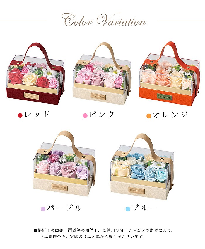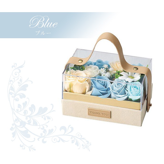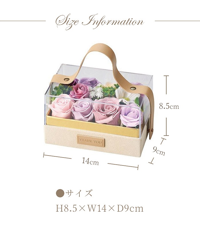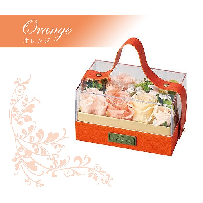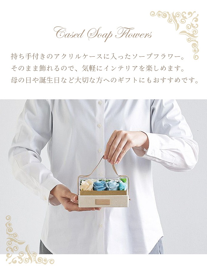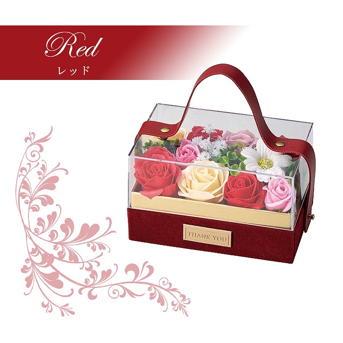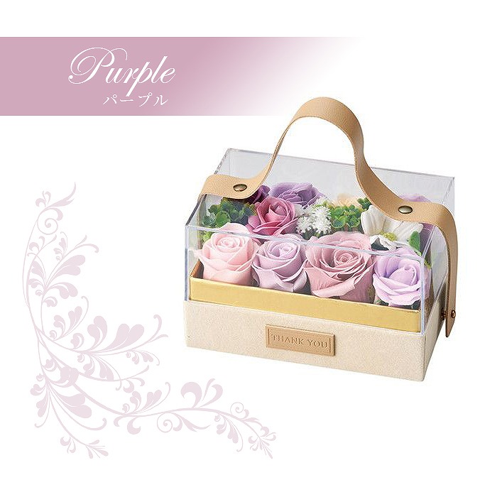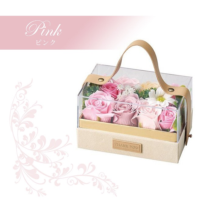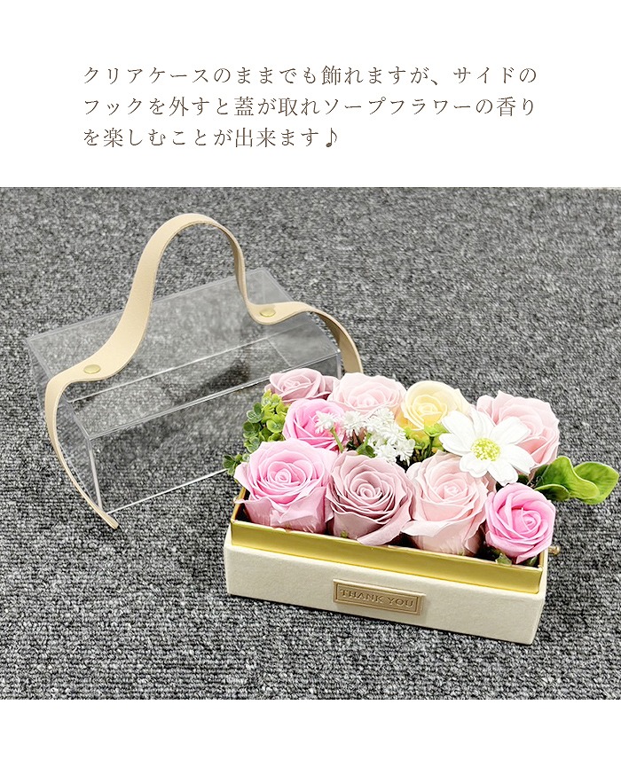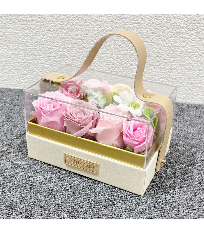 持ち手付きのアクリルケースに入ったソープフラワー。