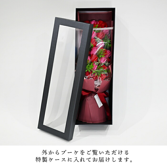 外からブーケをご覧いただける特製ケースに入れてお届けします。