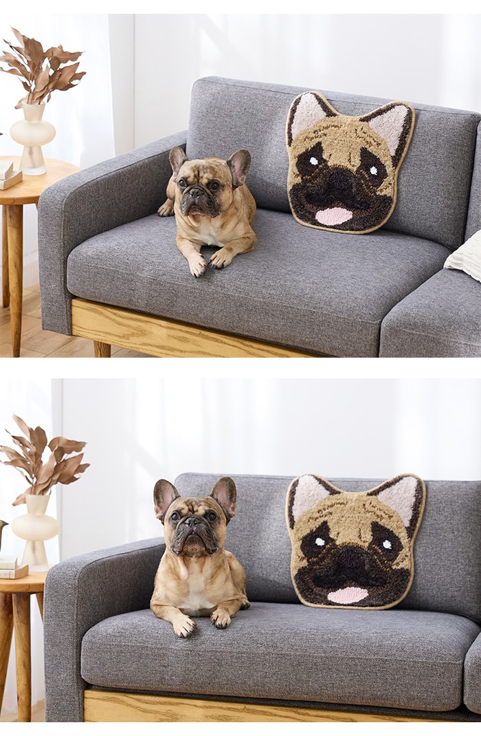 しまい忘れた舌がフレンチブルドッグのお茶目な性格を表現したチェアパットです。