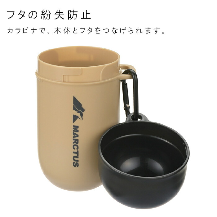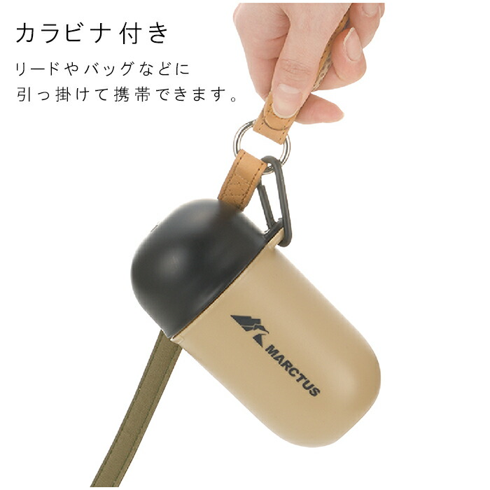カラビナ付きで、フタの紛失を防止でき、リードやバックに引っ掛けて携帯できます。