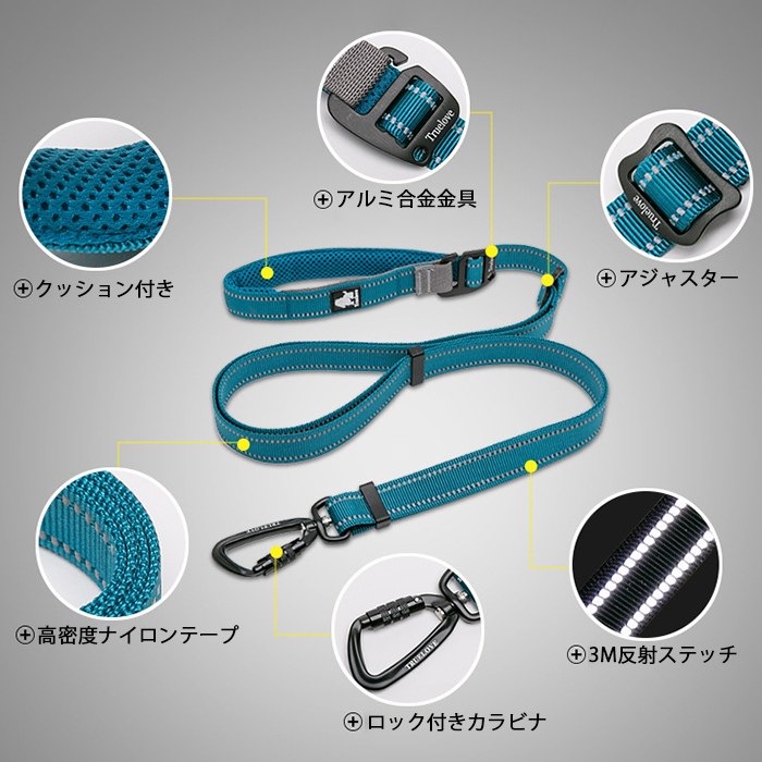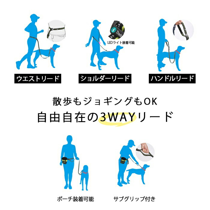 犬用3WAYリード ウエストリード 犬用 ショルダーリード ハンドルリード ハンズフリー犬用リード 高密度ナイロン 3M反射 アルミ合金カラビナ 自動ロック付きカラビナ 犬 LEDライト装着可能 クッション付きグリップ 多機能 中型犬 大型犬 アウトドア ランニング 夜道安全